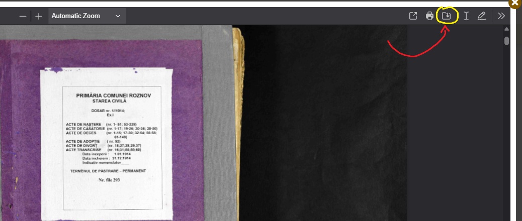- Descarcă fișierele PDF cu registrul scanat dacă vrei să le păstrezi local. Registrele voluminoase pot fi împărțite în mai multe fișiere.