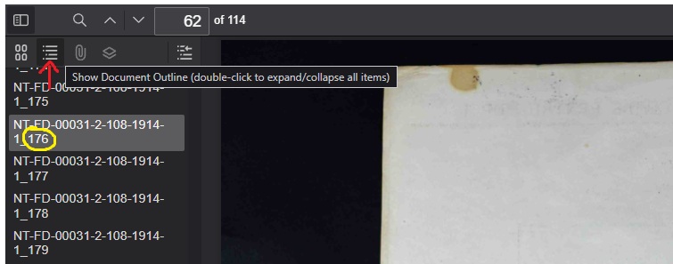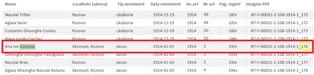 - Pentru accesarea unei înregistrări de interes, deschide fișierul IDX și activează căsuța de căutare (CTRL+F). Introdu numele de interes (sau părți din acesta) și notează numărul încercuit cu galben (care reprezintă nr. paginii) din ultima coloană pentru identificarea ulterioară a actului.
