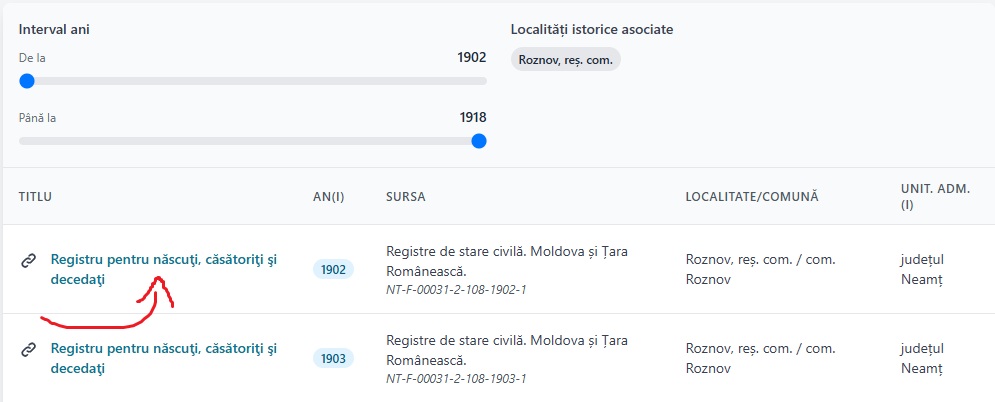 - Identifică o înregistrare de interes și descarcă documentele. Odată ajuns pe site-ul Arhivelor Naționale: