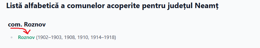 - Identifică localitatea istorică de interes. Sub fiecare comună actuală, vei descoperi denumirile istorice ale localităților din care provin registrele. Numele pot fi diferite de cele actuale.