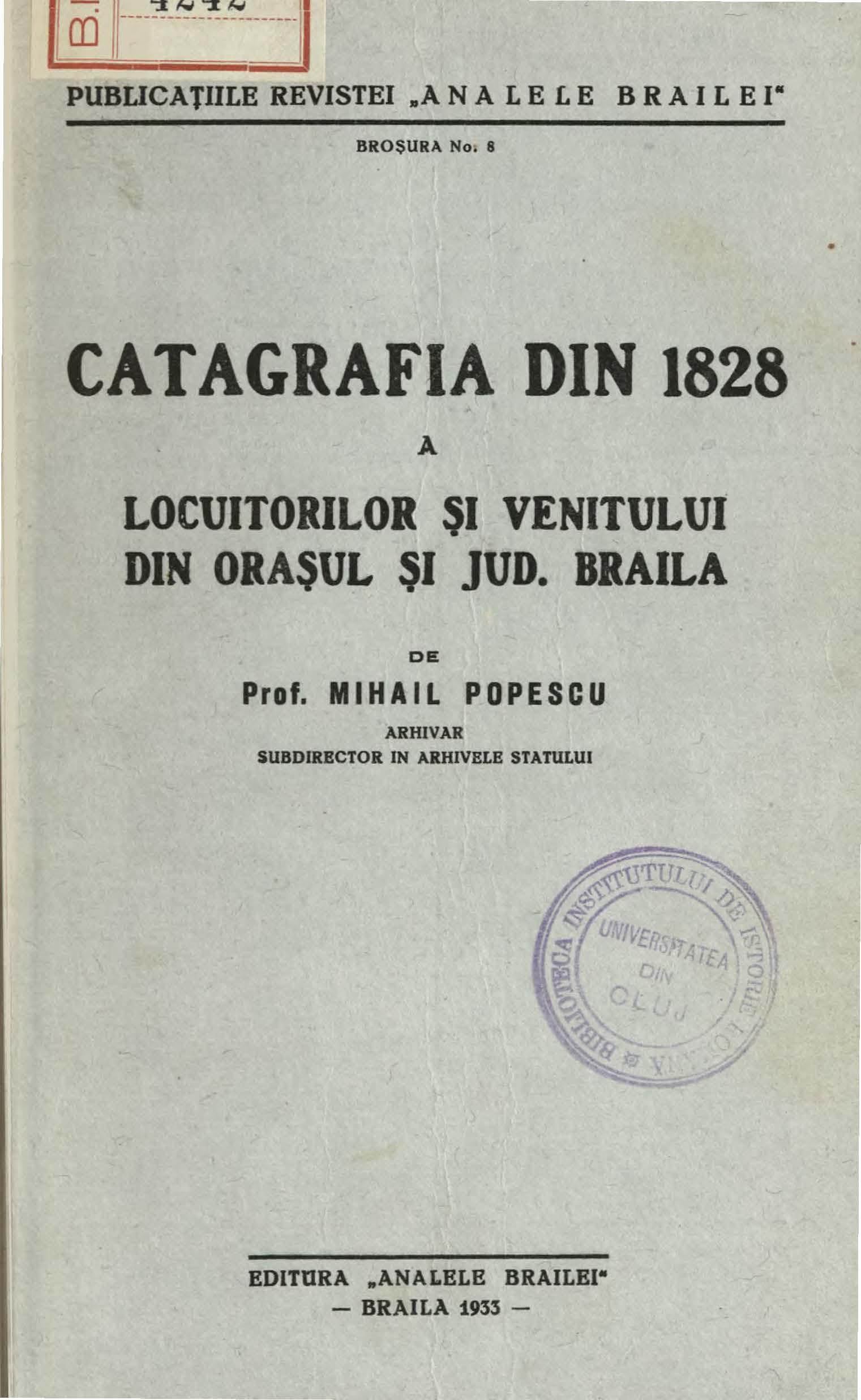 Mihail Popescu, Catagrafia din 1828 a locuitorilor și venitului din orașul și jud. Brăila, editura Analele Brăilei, Brăila, 1933 — editare după dosarul No. 1007, "Catastih de toate familiile ce s'au găsit la catagrafia în toate satele Brăilei și în orașul Brăila" a serdarului Grigore Tăutu, fondul "Administrative vechi", ANIC